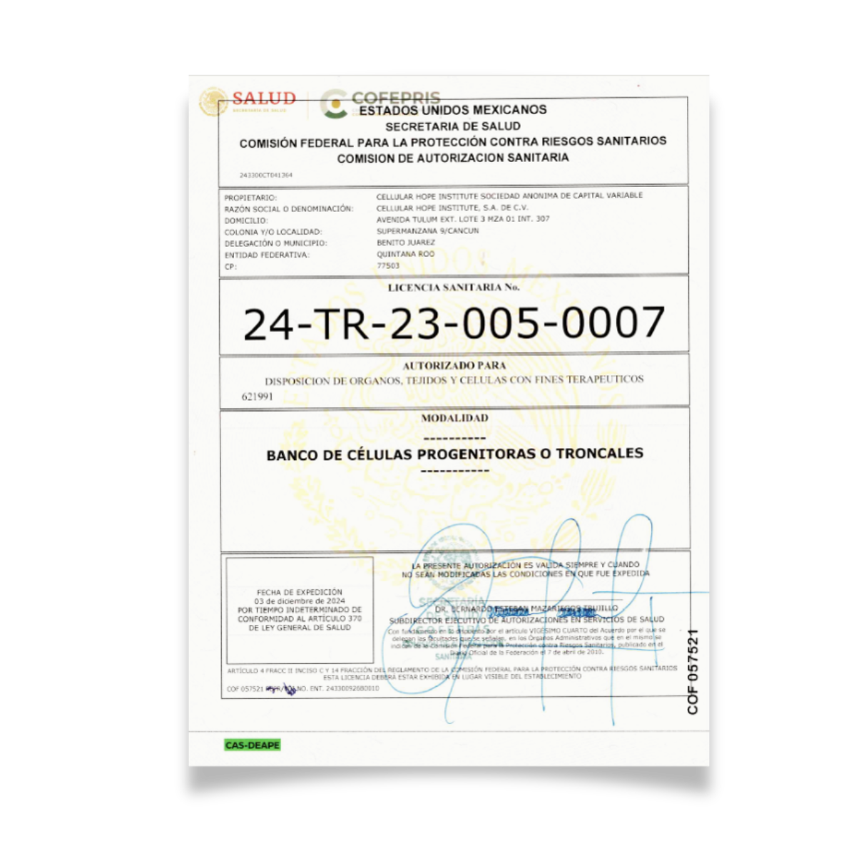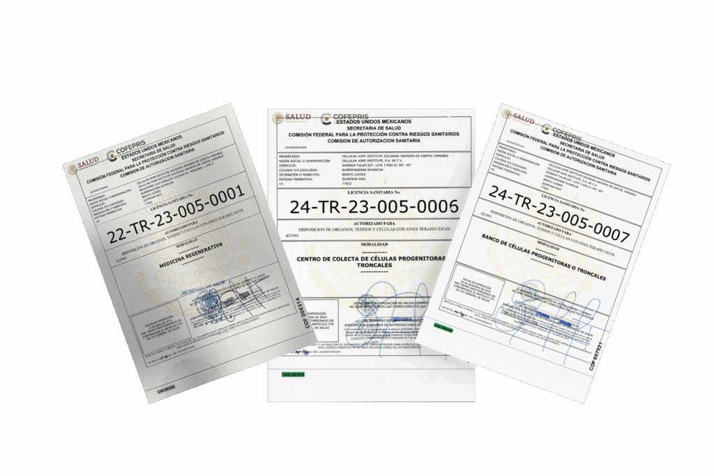 Our clinic proudly holds all three key licenses: for applying, storing, and manufacturing stem cells. These licenses are issued by COFEPRIS, Mexico’s health authority, and they reflect our commitment to meeting the highest safety and quality standards.